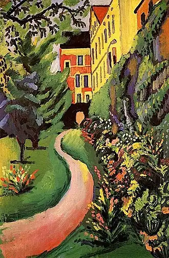В отличие от поздних пейзажей и сцен в парке, созданных Макке в Хильтерфингене, где цвета кажутся прозрачными и словно светятся изнутри, вызывая лирическое или сказочное настроение, в этом полотне сильнее выражен декоративный эффект в духе Анри Матисса. Декоративность композиции подчёркивает извилистая дорожка, уходящая в глубь под арку, увитую зеленью, и контрастирующая с пёстрыми цветами[1].