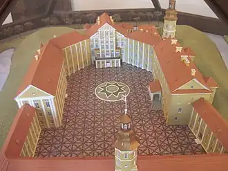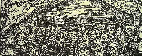 Около юго-восточной стены замка показано ещё одно большое многоэтажное здание, а вдоль северо-западной стены было небольшое одноэтажное помещение. Другое помещение, стоявшее вдоль северо-западной стены, — значительно больше. Центр замка показан как территория, засаженная деревьями, — возможно, тут находился небольшой замковый парк, что в целом было довольно распространённым явлением в замках Западной Европы.