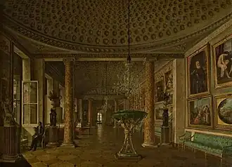 - Существенную перестройку Запасного дворца предприняли к совершеннолетию великого князя Николая Николаевича. Работы выполнялись в 1856—1857 по проекту архитектора И. И. Шарлеманя с помощью архитектора Царскосельского дворцового правления Н. С. Никитина и каменных дел мастера С. Ламони. За этот проект перестройки Шарлемань получил звание академика архитектуры.