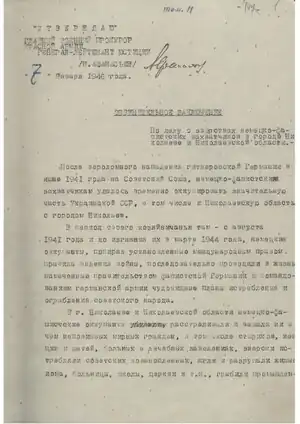 Сбор доказательств военных преступлений периода оккупации начался вскоре после освобождения Николаевской области. Уже 22 апреля 1944 года была образована Николаевская областная комиссия в составе ЧГК[11]. Подчиненные Николаевской областной комиссии местные комиссии опрашивали свидетелей и документировали данные о числе убитых и нанесенном оккупацией материальном ущербе. Так, уже 28 апреля 1944 года был составлен акт городской комиссии по ущербу, нанесенному Николаеву[12].