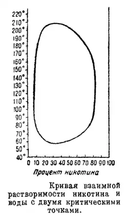 Никотин легко растворяется в органических растворителях и в воде. Водные растворы с концентрациями от 7,89 до 82 % мутнеют при температурах от 89 до 215 °C, при этих температурах у них меняются показатель преломления и удельного вращения. Растворы с концентрациями ниже 7,89 % и выше 82 % однородны независимо от температуры[18].