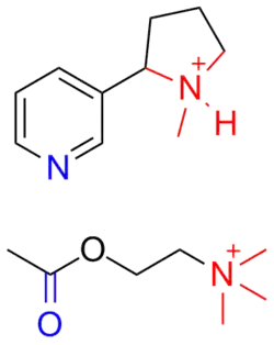 Никотин действует на никотиновые ацетилхолиновые рецепторы: протонированный атом азота пирролидинового цикла в никотине имитирует четвертичный атом азота в ацетилхолине, а атом азота пиридина имеет характер основания Льюиса, как и кислород кетогруппы ацетилхолина[22]. В низких концентрациях он увеличивает активность этих рецепторов, что, среди прочего, ведёт к увеличению количества стимулирующего гормона адреналина (эпинефрина). Выброс адреналина приводит к ускорению сердцебиения, увеличению кровяного давления и учащению дыхания, а также к бо́льшему уровню глюкозы в крови.