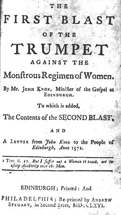 Летом 1558 года Нокс опубликовал свой самый известный трактат «Первый трубный глас против чудовищного правления женщин» (англ. The First Blast of the Trumpet Against the Monstruous Regiment of Women), в котором он писал: