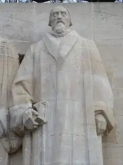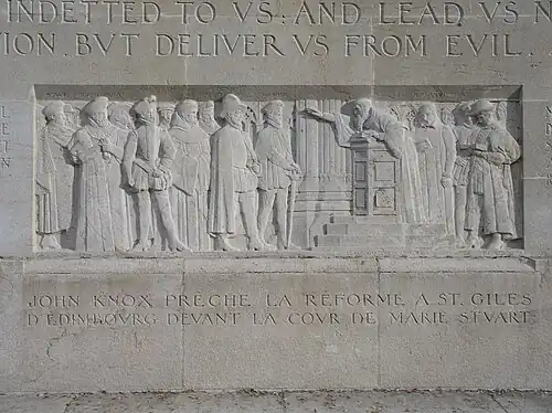 Барельеф, на котором изображена проповедь Джона Нокса в Сент-Джайлсе в Эдинбурге перед двором Марии Стюарт. Слева направо: Джеймс Стюарт (Морей), Джеймс Гамильтон (Шательро), лорд Дарнли, Мэтью Стюарт (Леннокс), Уильям Мейтланд (Летингтон), Уильям Кирколди (Грейндж), Джеймс Дуглас (Мортон), Нокс и Джордж Бьюкенен. Расположен на Стене реформаторов в Женеве.