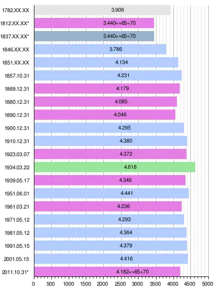 Изменение численности населения на территории судебного округа в 1782—2011 гг. по данным налоговых, поместных, военных, церковно-приходских, судебных (1782—1863 гг.) и общенациональных (в том числе пробных и регистрационных) переписей за 1869—2011 гг.[12][13]