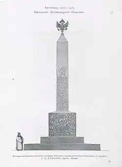 Обелиск решили установить у входа в Александровский сад. Так как первоначальный замысел автора не вызвал одобрения со стороны Академии художеств и требовал доработки, к возведению памятника приступили весной 1914 года[7]. Торжественная церемония закладки монумента состоялась 18 апреля, на ней присутствовали представители различных сословий: генерал от кавалерии Михаил Степанов, начальник Московского дворцового управления князь Николай Одоевский-Маслов, генерал-майор Александр Адрианов, московский губернатор граф Николай Муравьёв, попечитель Московского учебного округа Александр Тихомиров, московский комендант генерал-майор Тарасий Горковенко, московский вице-губернатор Адриан Устинов, исполняющий должность московского городского головы Виктор Брянский, управляющий Московской казённой палатой Павел Кутлер, московский уездный предводитель дворянства князь В. В. Голицын, ректор Московского университета Матвей Любавский, прокурор окружного суда Сергей Тверской, старшина ремесленного сословия Игнатий Александров, городская управа в полном составе, гласные городской думы и приглашённые лица. После молебна, проведённого епископом Серпуховским Анастасием, первые камни в основание обелиска положили Брянский, Адрианов, Одоевский-Маслов, Муравьёв и политик Николай Гучков. Церемония завершилась троекратным исполнением национального гимна Российской империи[8].