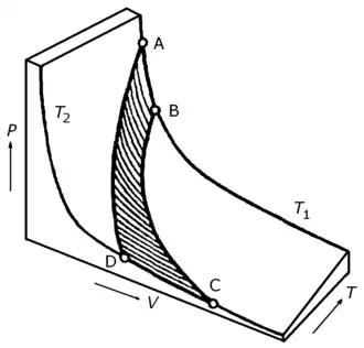 1. Изотермическое расширение (на рис. 1 — процесс A→B). В начале процесса рабочее тело имеет температуру , то есть температуру нагревателя. При расширении рабочего тела его температура не падает за счет передачи от нагревателя количества теплоты , то есть расширение происходит изотермически (при постоянной температуре) . При этом объём рабочего тела увеличивается, оно совершает механическую работу, а его энтропия возрастает.