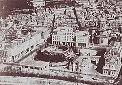 Параллели с современностью проводились и в других странах, прежде всего, в Италии в 1920-е — 30-е годы. Бенито Муссолини, часто обращавшийся к истории Римской империи в публичных выступлениях, нередко упоминал и Октавиана. В начале своего правления он часто обращался к образу Гая Юлия Цезаря — например, марш на Рим в 1922 году сравнивался с переходом через Рубикон в 49 году до н. э. В дальнейшем Муссолини всё чаще действовал по образу и подобию Октавиана — вероятно, из-за нежелания ассоциировать свою власть с кратким правлением Цезаря, закончившимся его убийством. Параллели с Августом особенно ярко проявились в масштабной градостроительной политике Муссолини в Риме и в покровительстве археологическим раскопкам и восстановлению зданий, построенных в том числе и Августом[23]. Впрочем, в публичных выступлениях дуче продолжал часто обращаться к образу Гая Юлия Цезаря[24]. В 1924 году началась реставрация Форума Августа, а к 2000-летию Октавиана в северной части Марсова поля была заложена площадь императора Августа (итал. Piazza[le] Augusto Imperatore). Проект площади, включавшей отреставрированные мавзолей Августа и алтарь мира, а также несколько новых зданий по периметру, разработал известный архитектор Витторио Баллио Морпурго. Хаотичную средневековую застройку на месте будущей площади снесли, хотя оставили три храма. Их сохранение должно было символизировать сосуществование в едином пространстве августовского Рима, папского Рима и нового Рима Муссолини. Мавзолей Августа, который в Средние века использовали как источник строительных материалов, а затем переделали в концертный зал, отреставрировали под руководством Антонио Муньоса. Алтарь мира пострадал ещё сильнее: его барельефы оказались во множестве частных коллекций, а над остатками находился кинотеатр «Олимпия». В результате, алтарь мира был перенесён на новое место, а вокруг него была возведена оболочка для обеспечения сохранности. Баллио Морпурго постарался тщательно вписать внешнюю оболочку алтаря мира и другие новые сооружения в ансамбль площади. В целом, площадь была закончена к 1941, хотя реставрация мавзолея завершилась к 2000-летию Октавиана. Возле мавзолея установили бронзовую табличку с текстом «Деяний божественного Августа», которая изначально находилась там. При этом поблизости была установлена и другая табличка — с описанием деяний самого Муссолини, выполненным в схожем духе[25]. Подражание дуче Августу проявилось не только в строительстве. Как и Октавиан, Муссолини восстанавливал в Риме прежние обелиски и устанавливал новые, вывезенные из завоёванной Эфиопии (между этой победой и завоеваниями Августа проводились параллели)[26].