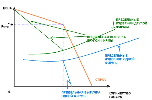 Модель ломаной кривой спроса: точка P(нет) — если фирма установит цену на товар выше данного уровня, то конкуренты не последуют за ней