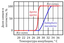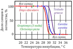 К видам с температурозвисимым определением пола относятся все крокодилы, большинство черепах, некоторые виды ящериц[50], а также гаттерии[51]. Обычно при низких температурах (ниже 27 ºС) из яиц вылупливаются особи одного пола, при высоких (выше 30 ºС) — другого, и только в небольшом промежуточном интервале — особи обоих полов. Так, у черепах при низких температурах появляются только самцы, у ящериц — только самки. Существуют отклонения от этой схемы. У каймановой черепахи при температурах от 20 до 30 ºС преобладают самцы, за пределами этого интервала — самки[50]. Эти температурные пороги обозначаются как порог I и порог II соответственно. Температуры, необходимые для развития каждого пола, называются женскими и мужскими благоприятствующими температурами (англ. the female and the male promoting temperature)[52] .