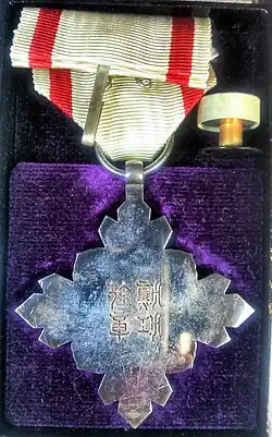 Знак ордена 1—5-го классов — серебряный позолоченный крест, каждое плечо которого составлено из трёх штралов, центральные из которых покрыты белой эмалью, а боковые — жёлтой. В центре расположен круглый медальон жёлтой эмали с широким ободком красной эмали. В углах креста — стилизованные изображения облаков светло-синей эмали; пространство между облаками и центральным медальоном заполнено чёрной эмалью. На оборотной стороне знака, гладкой без эмалей, изображены четыре иероглифа — «勲功位章» («награда за заслуги»).