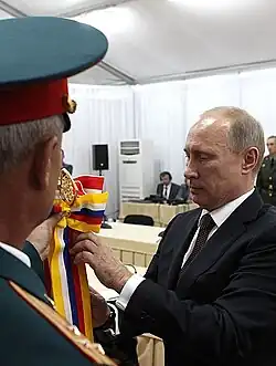 - ↑ Указ Президента Российской Федерации от 30 апреля 2015 года № 219 «О внесении изменений в Положение о государственных наградах Российской Федерации и статуты орденов Суворова, Ушакова, Жукова, Кутузова и Нахимова, утверждённые Указом Президента Российской Федерации от 7 сентября 2010 г. № 1099». Kremlin.ru. Дата обращения: 12 мая 2015. Архивировано 18 мая 2015 года.