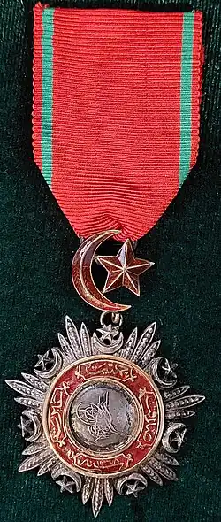 Знак ордена — семиконечная серебряная звезда, с золотым центральным медальоном с тугрой султана, обрамленным красным эмалевым кольцом, со словами «Рвение. Преданность. Лояльность» и датой «1268» (1852 год по исламскому календарю). Между лучами звезды — маленькие полумесяцы и звезды.