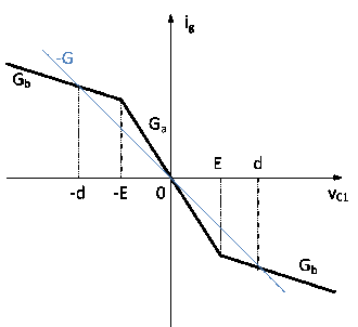 Эта нелинейная функция представлена графически на рисунке 2: крутизна внутреннего и внешнего участков есть Ga и Gb соответственно; при этом точки ±Е соответствуют изломам на графике.