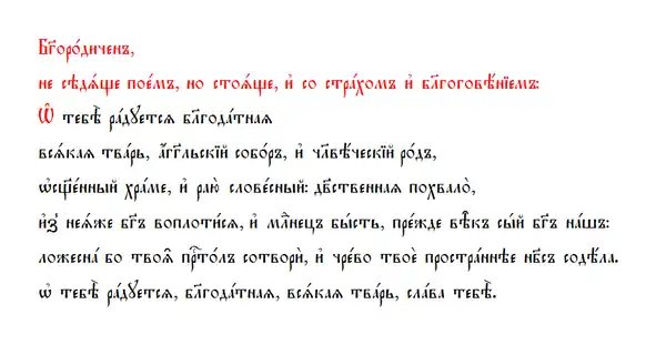 О тебе́ ра́дуется, Благода́тная, вся́кая тварь, А́нгельский собо́р и Челове́ческий род, Освяще́нный хра́ме и раю́ слове́сный, Де́вственная похвало́, из нея́же Бог воплоти́ся и Младе́нец бысть, пре́жде век сый Бог наш, ложесна́ бо твоя́ Престо́л сотвори́, и чре́во твое́ простра́ннее Небе́с соде́ла; о тебе́ ра́дуется, Благода́тная, вся́кая тварь, сла́ва тебе́.
