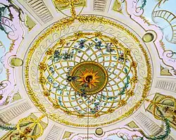 Западный (Охотничий, Белый, Штукатурный[20]) кабинет украшен лепными панно с атрибутами охоты[12], дверь расписана в технике гризайль[21]. В восточном (Фарфоровом, Мифологическом кабинете обезьян[22]) кабинете орнаментальная роспись продолжена рельефной лепкой с горельефами обезьян, амуров и птиц, поддерживающих полки для фарфоровых вещиц[12] на мифологические темы[22], плафон создан Серафино Бароцци[12]. Бароцци также расписал в темперной технике по гипсовому покрытию плафон главного помещения, Круглого зала. Стены Круглого зала покрыты панно с подвешенными на лентах гирляндами, венками и музыкальными инструментами. Роспись будто продолжается падугами с орнаментальной росписью, в центре плафона изображён золотой увитый зеленью трельяж, будто бы открытый в небо. В отделке использована позолота[10], из искусственного мрамора сделаны наличники дверей[5].