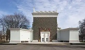 Боковые части здания ниже, оформлены лепными элементами. Прежде их стены по главному фасаду были украшены барельефом на тему дружбы народов советских республик. Изначально цоколь, ступени и площадка перед павильоном были облицованы лабрадором, но затем его заменили более прочными материалами[3].
