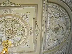 Интерьер усадебного дворца отличается эклектичностью и помпезностью. Композиционным центром здания является трёхмаршевая лестница с мраморными ступенями и балясинами. Полы выстланы паркетом или мозаикой из мраморной крошки; потолок декорирован лепниной и украшен великолепными люстрами, в комнатах изысканные зеркала и аллегорические античные скульптуры[11].