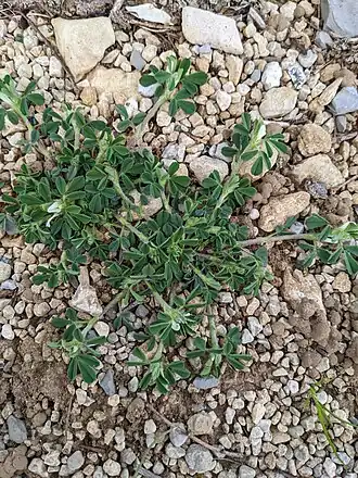 Однолетнее травянистое растение. Стебли приподнимающиеся, редко прямые, слабоветвистые, 5—20 (30) см высотой, более или менее пушистые. Прилистники маленькие, цельные; листочки от обратно-яйцевидных до обратно-ланцетных, к основанию клиновидных, 5—12 мм длиной и 3—6 мм шириной, вверху остро-зубчатые.