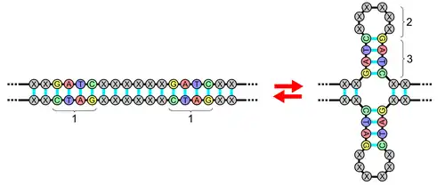 Палиндромы в ДНК: 1 — палиндром; 2 — кольцо; 3 — стебель