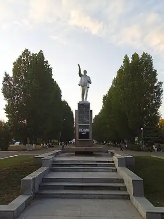 Памятник серийный. Ленин изображён в минуту выступления. Его правая рука в призыве обращена к народу. Образ создан Г. Д. Алексеевым, который после встречи с Лениным в ноябре 1918 года создал скульптуру «Призывающий вождь». В 1924 году правительственной комиссией по увековечению памяти Ленина эта работа была утверждена для широкого воспроизводства во многих городах Советского Союза. Материал — бетон, тонированный под бронзу, постамент из бетона, облицованного мраморными плитами. Высота постамента — 5 м, фигуры — 3 м.[2].