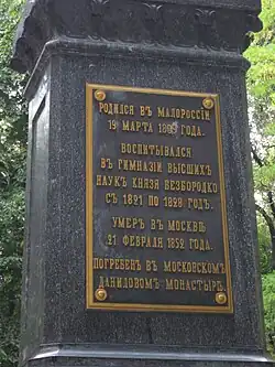 На лицевой и тыльной сторонах вмонтированы медные доски с текстами, выполненными дореформенным шрифтом: «…определено мнѣ чудной властью… озирать жизнь сквозь видный миру смехъ и незримыя невидимыя ему слезы !». «Родился въ Малороссии 19 марта 1809 года. Воспитывался въ гимназіи высших наукъ князя Безбородько с 1821 по 1828 год. Умер в Москве 21 февраля 1852 года. Погребенъ въ Московсъкомъ Даниловомъ монастыріе».