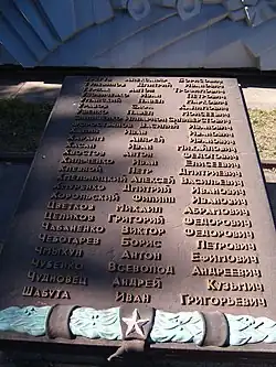 - Первая справа от колонны, размеры 11,85×2,3 м. Рельефно изображена двухстрочная надпись на русском языке: «НИКТО НЕ ЗАБЫТ, / НИЧТО НЕ ЗАБЫТО» и дата «1945».