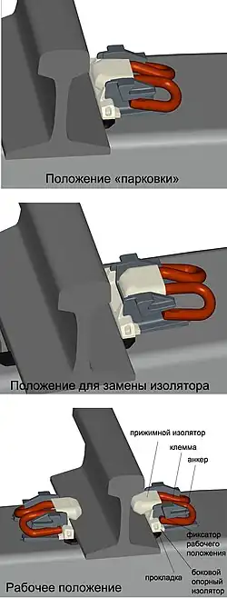Установка в рабочее положение. Шпалы поставляются на место сборки рельсошпальной решетки со всеми компонентами в сборе, клемма установлена в положении «парковки». После укладки рельсов клемма механически переводится в рабочую позицию. Номинальное прижимное усилие создается автоматически.