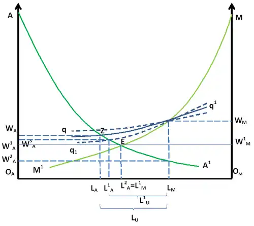 - таким образом, при нейтральном отношении мигранта к риску в точке устанавливается равновесный уровень пересечения кривых и , где определяется уровень занятых в аграрном секторе и занятых в промышленности на уровне занятых , зарплата в аграрном секторе и уровень безработицы ;
