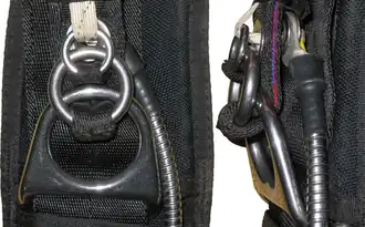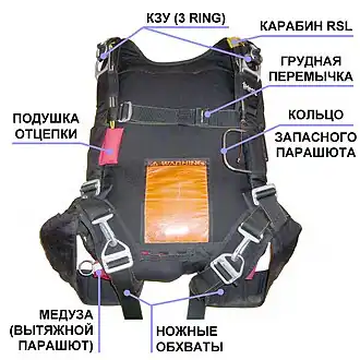 • Отцепка и КЗУ. Позволяют отцепить основной парашют в случае его отказа или ненормальной работы. Кольцевое замковое устройство (3 Ring) состоит из трёх колец разного диаметра и петли зачековки. Чтобы отцепить основной парашют, необходимо выдернуть подушку отцепки. Подушка отцепки, или релиз, имеет два троса, выполненных из пластика (на некоторых ранцах, например ПО-16, могут использоваться стальные тросы), пропускаемых по шлангам — каналам к правому и левому свободному концу основного купола, на которые замыкается замок КЗУ,- закреплена на подвесной системе, как правило, с правой стороны с помощью текстильной застёжки (липучки). Вводится в действие обеими руками, сперва парашютист берётся за подушку правой рукой, накладывает на неё левую, затем энергичным движением вниз под 45 градусов выдёргивает трос отцепки основного парашюта и, держа подушку отцепки в правой руке, свободной левой ударяет по тросу, пробивая его до конца.