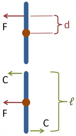 Действие силы, приложенной к твёрдому телу на некотором расстоянии от центра масс (в точке, в которую из центра масс можно провести вектор ), эквивалентно действию такой же силы, приложенной непосредственно к центру масс, комбинированной с некоторой парой сил, такой, что , то есть с моментом, равным моменту силы относительно центра масс (в частности, если , можем задаться , в таком случае одна из сил будет приложена в той же точке, что и исходная, и составит ).