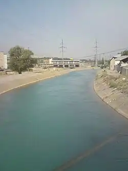 Паркентский канал в верхнем течении (на заднем плане видны сооружения Газалкентского гидроузла