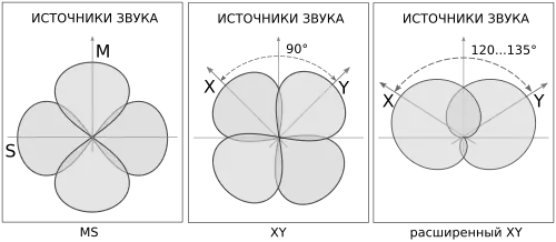 - Третья конфигурация аналогична XY, но угол между осями двух микрофонов устанавливается произвольно. В зависимости от условий записи он может быть и больше, и меньше стандартных 90°[53].