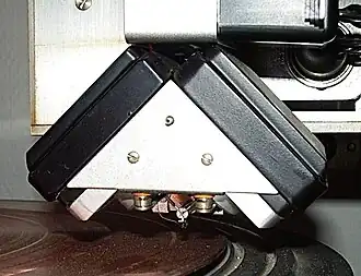 В патенте 394325 Блюмлейн предложил иное решение: две взаимно-перпендикулярные составляющие колебания резца, нареза́ющего единственную стереоканавку, следует направить под углами 45° и −45° к поверхности диска[63][59]. Электрические сигналы левого и правого каналов, возбуждающие приводы резца, должны быть скоммутированы таким образом, чтобы поперечные колебания стереоканавки соответствовали суммарному сигналу двух каналов (M), а её глубинные колебания — разностному (S)[63]. При такой коммутации каналов стереофоническая пластинка обратно совместима с монофоническими звукоснимателями наиболее распространённой поперечной системы[63].