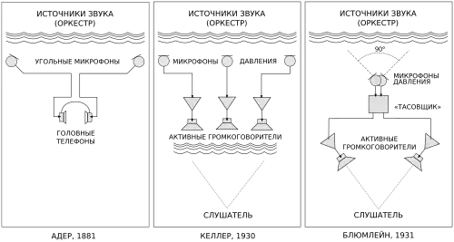 В 1881 году Клеман Адер продемонстрировал на парижской электротехнической выставке «театрофон» — практическую систему прямой трансляции звука по телефонным линиям[13][14]. Угольные микрофоны, установленные на сцене Парижской оперы, модулировали электрические токи в телефонных линиях и возбуждали звуковые колебания в телефонных капсюлях абонентов[14]. Случайно, экспериментируя с двумя параллельными трансляционными линиями, Адер обнаружил стереоэффект. Система стереофонической трансляции, в которой каждое ухо слушателя воспринимает сигнал лишь одного из двух стереоканалов, получила название бинауральной (в публикациях Адера — фр. audition binauriculaire)[15]. Бинауральный «театрофон» не нашёл спроса из-за низкого качества звучания и необходимости использовать две телефонные линии (для левого и правого стереоканалов); коммерческие сети «театрофона», успешно действовавшие во Франции, Великобритании, Италии и Венгрии[14] до конца 1920-х годов, были монофоническими[13][14][16].