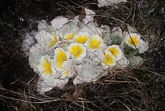 Цветки диаметром 2,5–3 см, кремово-жёлтые с золотисто-жёлтым центром, распространяющимся на зубчатые доли лепестков[3]. Цветки собраны в зонтики от трёх до десяти, на стеблях высотой всего 1 см, которые обычно полностью скрыты в листьях весной. Цветочные почки развиваются поздней осенью, а цветение наступает ранней весной[2].