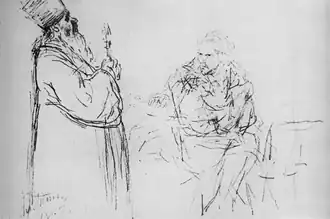 Датировку второго по порядку создания эскиза из Праги (карандаш, бумага, 23 × 15 см[52]) 1879 годом Лясковсая также признавала ошибочной. Образ священника в скуфье не отличается от первого наброска. По мнению искусствоведа, он изображает грубую силу. Изменился облик революционера. Его волосы короткие, глаза глубоко запали в череп, лицо несколько опущено, поэтому его выражение читается слабо, но в нём всё-таки заметна «страстная сила убеждения», правая рука приподнята, левая же охватывает колено[53].