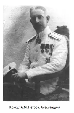 26 июля 1910 г. Высочайшим приказом по гражданскому ведомству № 50 А. М. Петров был назначен консулом в Александрии. Как и другие русские дипломаты, в отпусках он бывал не часто: в двухмесячном — 1911 г. и трехмесячном в 1914 г., из которого был вызван раньше срока после объявления Германией войны России. Больше Александр Михайлович на Родине не был.