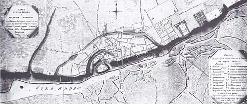 Состояли из замка и укреплений вокруг посада. Замок располагался на городище, на левом берегу реки Пины. В описи города за 1561—1566 годы упоминается башня «Владычная», которая стояла отдельно в северной части замковых укреплений. Кроме брамы с подъёмным мостом перед ней в линии обороны стояли еще не менее 3 башни, названия которых неизвестны. Периметр замковых укреплений составлял 0,5 км. Описание конструкции оборонительных стен замка отсутствует. Однако из повинностей крестьян замковой волости следует, что они были обязаны ухаживать за городней, сторожить замок, давать подводы. Мещане вместе с церковниками также выполняли замковую работу — рубили замок и паркан (оборонительное сооружение из деревянных столбов), ухаживали за оборонительным рвом и мостами.