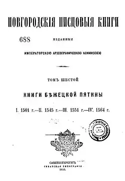 - ↑ Абрамович Г.В. Бежецкая пятина // Аграрная история Северо-Запада России XVI века : статья. — 1974. — С. С. 184-240.