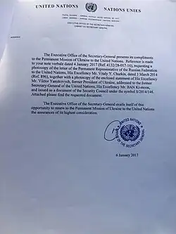 - ↑ Киев заявил о получении от ООН просьбы Януковича ввести войска России на Украину. Lenta.ru (17 января 2017). Дата обращения: 19 марта 2017. Архивировано 20 марта 2017 года.