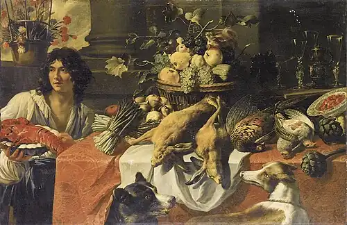 Натюрморт с артишоками, корзиной, кабачками, двумя собаками и мясными потрохами