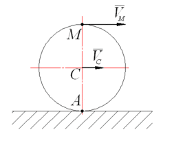 Если в данный момент для точки контакта колеса с поверхностью (точки А) эти скорости равны по модулю и противоположны по направлению, имеет место случай чистого (без проскальзывания) качения, что показано на рисунке. Только в этом случае скорость точки М будет в 2 раза больше скорости точки С и направлена в ту же сторону.