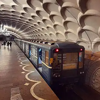 ![]() Электропоезд Еж3 на станции Дворец Спорта Харьковского метрополитена | |