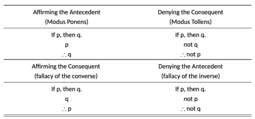 Из возможных форм «смешанных гипотетических силлогизмов», две являются корректными, а две — некорректными. Утверждение антецедента (modus ponens) и отрицание консеквента (modus tollens) являются корректными.