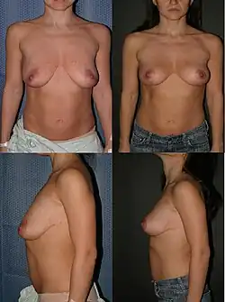 В некоторых случаях, с целью получения высокой проекции желез, целесообразно выполнять подтяжку вместе с увеличением груди. Это может позволить получить более эффектные контуры груди, особенно в тех случаях, когда железистой ткани практически нет. При стандартном оперативном вмешательстве по увеличению груди опущение никуда не исчезнет, а наоборот усилится из-за увеличения массы самой груди.