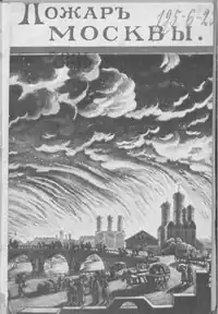 Самый крупный московский пожар столетия начался в ночь со 2 (14) на 3 (15) сентября 1812 года, после вступления в город войск Наполеона. Сильное возгорание длилось около недели и окончательно утихло лишь к 6 (18) сентября. По свидетельствам очевидцев, «в покинутой жителями Москве очаги пламени, раздуваемые ураганным ветром, слились в один огромный костер». По распространённой версии, приказ поджигать покинутый город отдал московский генерал-губернатор, граф Фёдор Ростопчин[235]. Однако большой урон городу нанесли оккупанты, на Тверской сохранилось лишь 12 домов, а в Китай-городе — два, в пожаре погибли Императорский университет с библиотекой и архивами. Были утрачены многие памятники культуры: считается, что в то время сгорел единственный экземпляр «Слова о полку Игореве» из коллекции Алексея Мусина-Пушкина[236]. При отходе французские войска заминировали Грановитую палату, Арсенал, колокольню Ивана Великого, башни и стены Кремля. Несколько башен с пряслами, часть Арсенала и две пристройки к колокольне были взорваны. Среди уцелевших исторических зданий — Английский двор XV века в Зарядье, самое старое «многоэтажное здание» древней столицы — сушило Симонова монастыря, а также дом Фёдора Растопчина[237]. В результате отступления, по подсчётам историков, сгорело две трети построек: из 2567 каменных домов сгорело около двухсот, а из 6591 деревянных уцелело порядка 250. Кроме того, в огне пострадали 122 храма, 8251 складское и торговое помещение. Общий ущерб от городских разрушений был оценён в 320 миллионов рублей[238][239]. По масштабам реконструкции этот проект сравнивают с возведением Петербурга в XVIII веке[208].