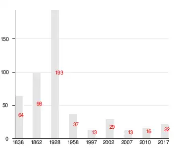 | 1838 | 1862[17] | 1928 | 1958 | 1997 | 2007[18] | 2010[19] |