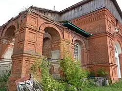 Каменная, неоштукатуренная, шестистолпная, одноглавая, крестово-купольная церковь, удлинённая по оси запад—восток. С востока к центральному объёму (нефу) примыкает округлая апсида. Храм был увенчан шатром с фонариком на восьмерике (не сохранился), сейчас — маленьким куполом на глухом восьмигранном барабане. С запада соединяется с двухъярусной колокольней — восьмерик на четверике, увенчанный шатром. На 1-м ярусе расположен главный вход, второй ярус и шатёр — не сохранились. Так как не сохранились (были разрушены) оригинальные шатры над нефом и колокольней, храм перекрыт двухскатной крышей. С севера и юга к колокольне (слева и справа от главного входа) примыкают укрытые шатрами тамбуры-крыльца, к которым ведут лестницы (сохранились только стены).