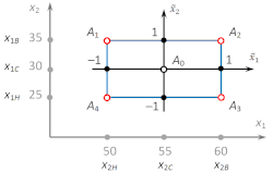 Чтобы облегчить решение системы, проведём нормировку факторов. Верхним значениям факторов присвоим нормированное значение +1, нижним значениям — нормированное значение −1, среднему значению — нормированное значение 0. В общем виде нормировка фактора выражается формулой